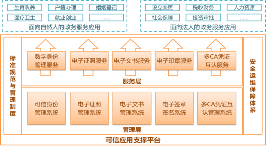 北京数字认证提出的可信应用支撑体系是针对“互联网+政务服务”环境不同用户的需求,提供的满足不同强度的统一身份认证服务、电子签章印章、电子文书和电子证照服务的解决方案。